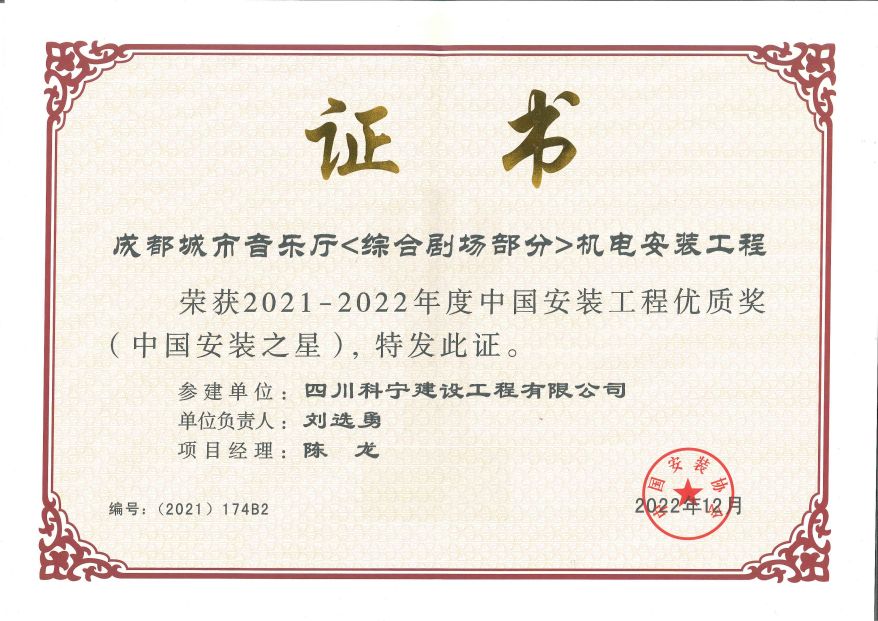 四川科寧建設工程有限公司參建的成都城市音樂廳(綜合劇場部分)機電安裝工程榮獲中國安裝工程優質獎(中國安裝之星)